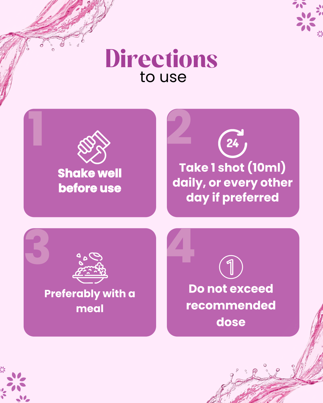 Shake well, take 1 shot (10 ml) daily or on alternate days, preferably after a meal.