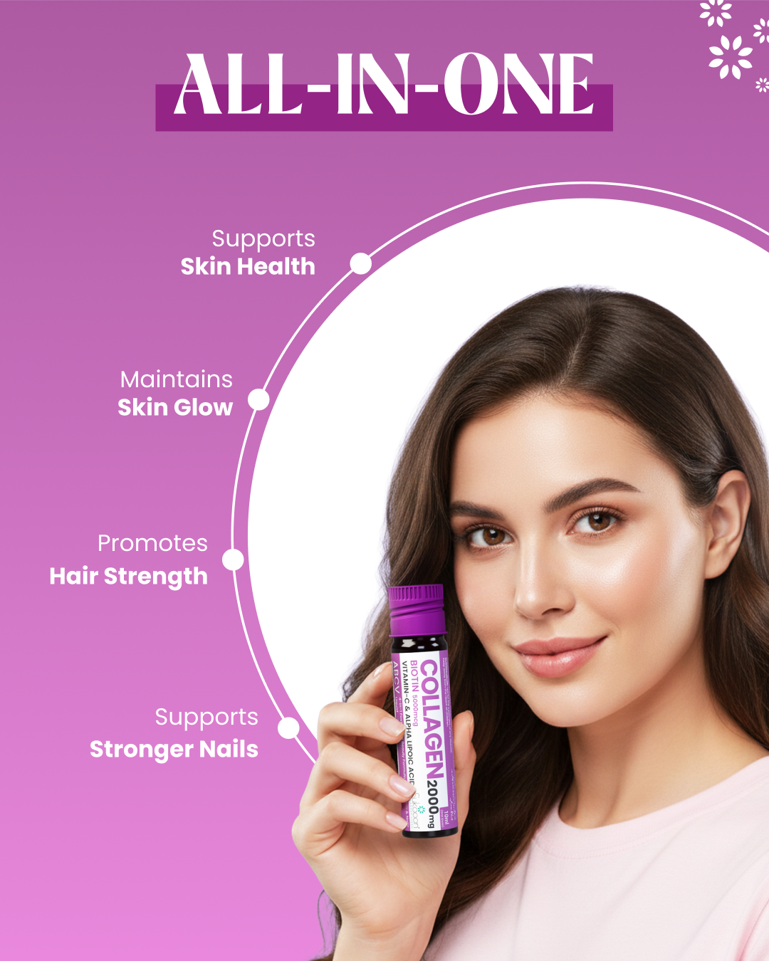 This advanced 4-in-1 formula delivers Collagen, Biotin, Vitamin C, and Alpha Lipoic Acid in one easy-to-drink shot to support glowing skin, stronger hair, and healthy nails.