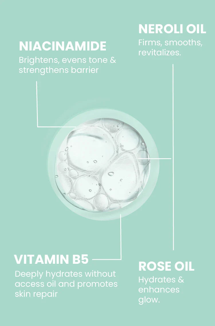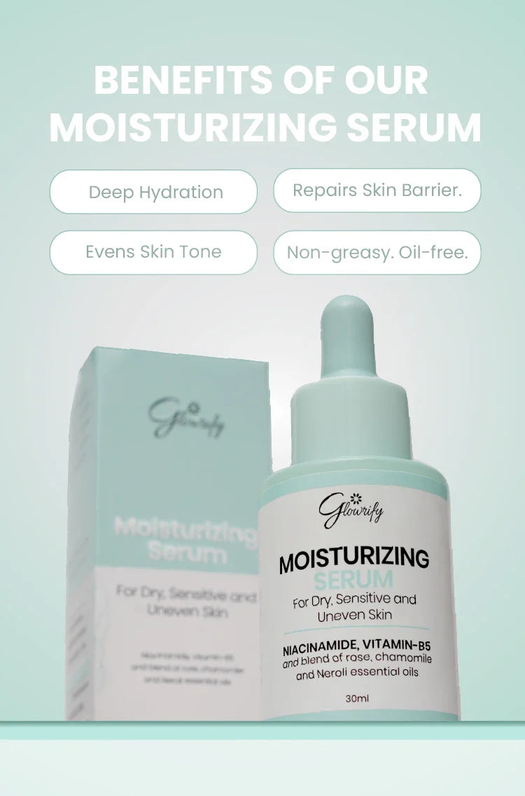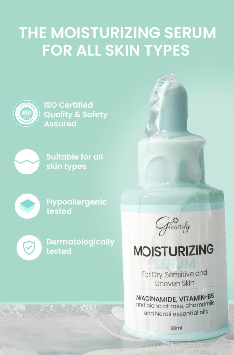 Glowrify Moisturizing Serum is a deeply hydrating formula designed to restore moisture, soothe irritation, and improve skin texture. Infused with Niacinamide and Vitamin B5, it strengthens the skin barrier, reduces redness, and enhances elasticity. The blend of Rose, Chamomile, and Neroli essential oils provides intense nourishment, leaving your skin soft, smooth, and radiant.