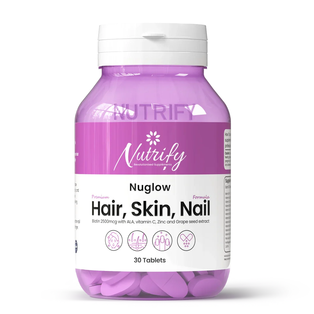 Nuglow by Nutrify is a complete Hair, Skin & Nail supplement that works from the inside to help you look and feel your best. It contains a powerful mix of Biotin, Vitamin C, Collagen, Zinc, Grape Seed Extract, and more than 15 other essential nutrients.